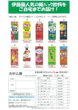 2020/07/02伊藤園人気の紙パック飲料の販売! 伊藤園人気の紙パック飲料を ご自宅までお届けします! 紙パックなので飲み切りサイズで便利です。 一日分の野菜や理想のトマトなどはお料理にもつかえますよ! ご注文は TEL:0120-70-1331 7/31までの受付となります。 ※お届けは弊社配達エリア内に限ります。 ※お支払いは代引きのみです。