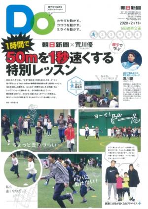 2020/02/13親子をつなげるスポーツペーパーDO 走り方特集号1 1時間で 50mを1秒速くする 特別レッスン 2020年1月12日、❝日本で最も多くの足を速くしたコーチ❞こと 荒川優さんによる走り方教室が静岡県草薙運動公園で開催されました。 120組240人の親子が、たったの1時間で50mを1秒速くする というミッションに挑みました。その結果は果たして・・・・・・。 朝日新聞DOでは、これから6回にわたってイベントの模様と、 荒川コーチからの足を速くするためのアドバイスをお届けします。 次回の発行は2020年3月10日予定です。